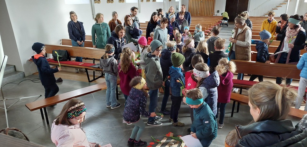 Andächtig sind wir gemeinsam mit Jesus auf seinen letzten schweren Weg gegangen, den Kreuzweg. Dabei haben wir gemeinsam ein Kreuz mit Hölzern, Seilen, Kerzen, Steinen und roten Herzen verziert. Ostern verändert die Bedeutung des Kreuzes von Hilflosigkeit, Leid, Verzweiflung, Tod hin zu einem Zeichen für neues Leben, das stärker ist als der Tod. Dies haben wir mit Tulpen versucht zu gestalten, damit wir neuen Mut, Kraft und Glauben erhalten. Mit einem gemeinsam gesungenen "Vater unser" haben wir der Verbindung zu Gott und der Kirche Ausdruck verliehen.